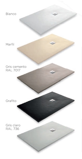 - Platos de ducha cuadrados y rectangulares, extraplanos de resinas de poliuretano con cargas minerales (dolomitas). Coloreado en masa.