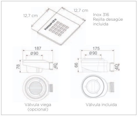 - Incluye rejilla (Inox 316) y válvula de desagüe